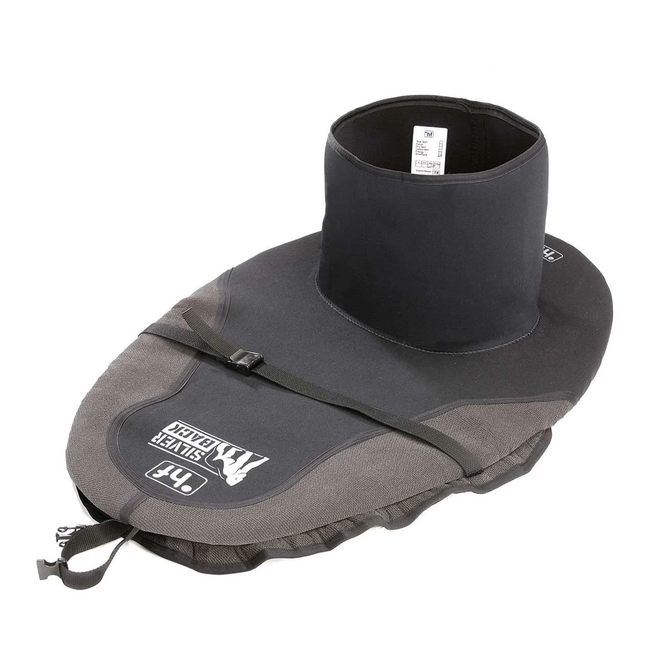 Mehr Sicherheit, mehr Komfort, beste Abdichtung und hoher Abrieb-Schutz – dafür steht die HF SILVERBACK Spritzdecke. Die Wildwasser-Spritzdecke für höchste Ansprüche und bleibt auch in wuchtigen Rapids und bei Wasserfällen zuverlässig auf dem Boot. Zum Öffnen der Spritzdecke bietet die Silverback sowohl eine vordere Griffschlaufe als auch einen Kniegurt. Damit ist in allen Situationen ein schneller Ausstieg aus dem Boot garantiert möglich. Um die Widerstandsfähigkeit noch weiter zu steigern, sind die seitlichen Ränder mit einer Aramid-(„Kevlar“) Verstärkung ausgestattet. Besondere Dichtigkeit erreicht die Silverback durch die „Phatlip“: Der Süllrandgummi presst die Neoprenlippe unter und an den Süllrand, so dass Wasser nicht eindringen kann. Zusätzlich zur Latexverstärkung im Süllrandbereich weist die Silverback weiteren sinnvollen Abriebschutz auf. Als Schutz vor Abrieb durch hohe Rückengurte sowie durch den am Körper getragenen Wurfsack dient die Latexverstärkung rund um den Kaminansatz auf der Tellerinnenseite. Natürlich decken die seitlichen Kevlarverstärkungen der Silverback exakt die besonders beanspruchten Bereiche ab. Ein kleines feines Detail an der Silverback ist der Clip an der vorderen Öffnungsschlaufe. Damit kann die Decke zum Laufen hochgeklappt und am Schulterträger der Schwimmweste befestigt werden. Das macht Laufen und Klettern in Kajakausrüstung komfortabler und sicherer. Einzigartig ist der reflektierende Print auf der Neoprenteller-Unterseite: Wird die Spritzdecke beim Laufen hochgeklappt und mit dem kleinen Clip am Schulterträger der Schwimmweste befestigt, ist nicht nur der schwarze Neoprenteller zu sehen, sondern natürlich auch der hoch reflektierende Druck. Damit ist der Paddler z.B. auch auf der Straße auf dem Weg zum Auto immer gut erkennbar.