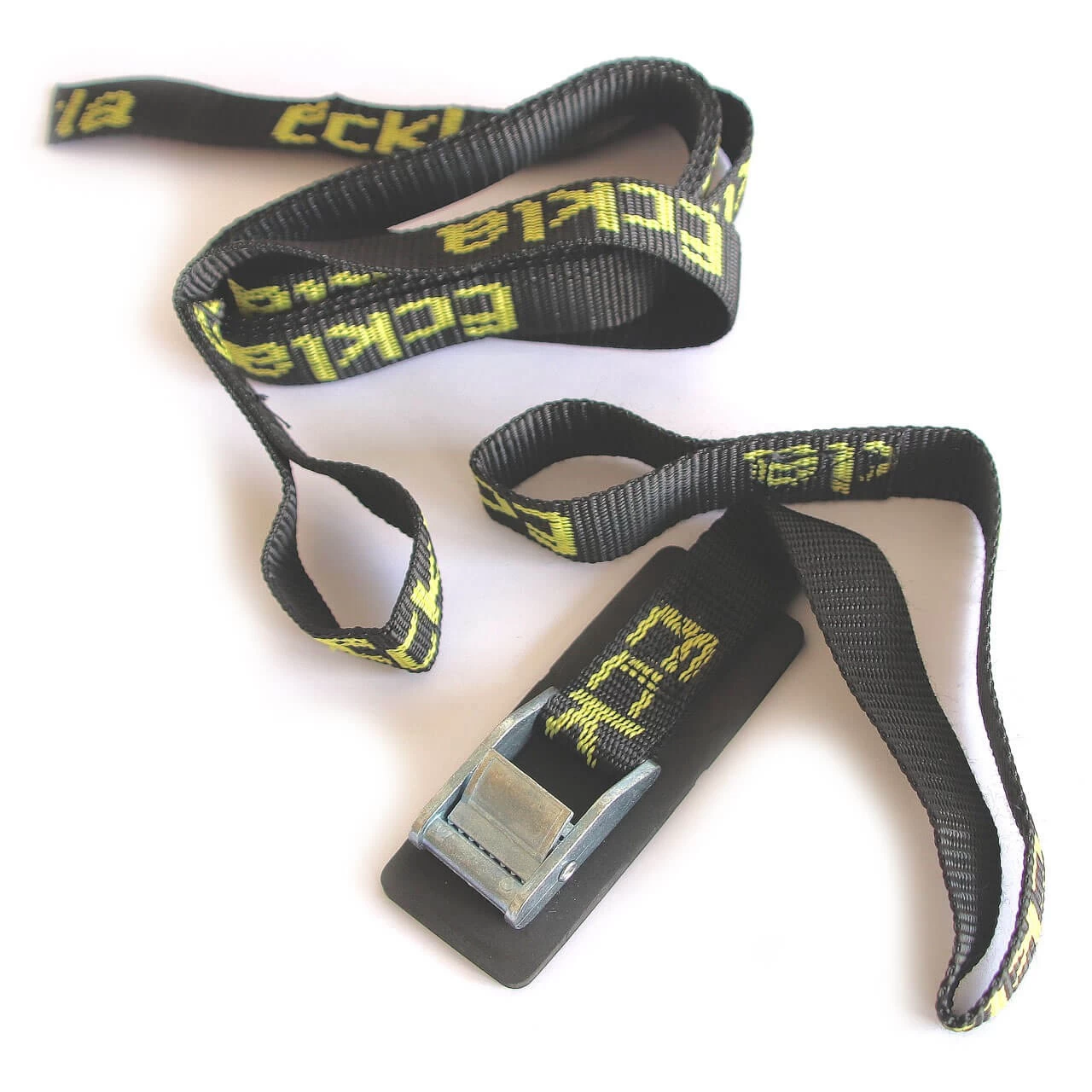 Der Eckla Zurrgurt 2-teilig für Bootswagen ist ein knapp zwei Meter langer zweiteiliger Spanngurt mit Schlaufen an den Enden. Er kann auf das Rohr des Kanuwagen aufgefädelt werden. Damit lässt der Spanngurt sich bei fast jedem Kajakwagen nachrüsten. Die Enden werden seitlich über das Boot gezogen und dann gespannt. Bei Bedarf kann die schnallen-lose Seite gekürzt werden.