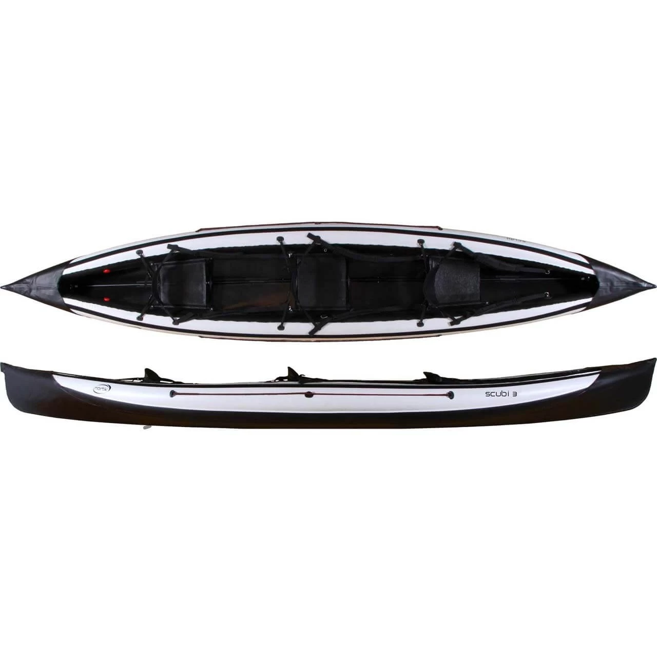 Der Nortik Scubi 3 ist ein unkompliziertes Freizeitkajak für die ganze Familie. Ideal für 2 Erwachsene mit Gepäck, 3 Erwachsende oder 2 Erwachsene und 2 Kindern. Der Scubi 3 ist ein Hybridkajak: er vereint Faltboot und Schlauchboot. Das Aluminiumgestänge sorgt beim Paddeln für Spurtreue und Formstabilität. Es lässt sich beim Aufbau ohne Mühe in der Bootshaus aus reißfestem PVC Gewebe positionieren. Erst im zweiten Schritt wir dann die Bootshaut über die seitlichen Luftschläuche gespannt. Diese sorgen zusätzlich für eine extrem hohe Kippstabilität. Das Boot ist mit Schenkelgurten ausgestattet, die machen das Boot auch bei Wellengang und im leichten Wildwasser zum Hit. Die offene Scubi Variante mit optionalem Verdeck, bietet nicht nur großen Personen ausreichend Platz sondern bietet auch reichlich Stauraum. Mehrtagestouren werden zum Kinderspiel. Der Scubi 3 lässt sich auch alleine paddeln. Dazu wird nur ein Sitz in mittlerer Position eingesetzt.