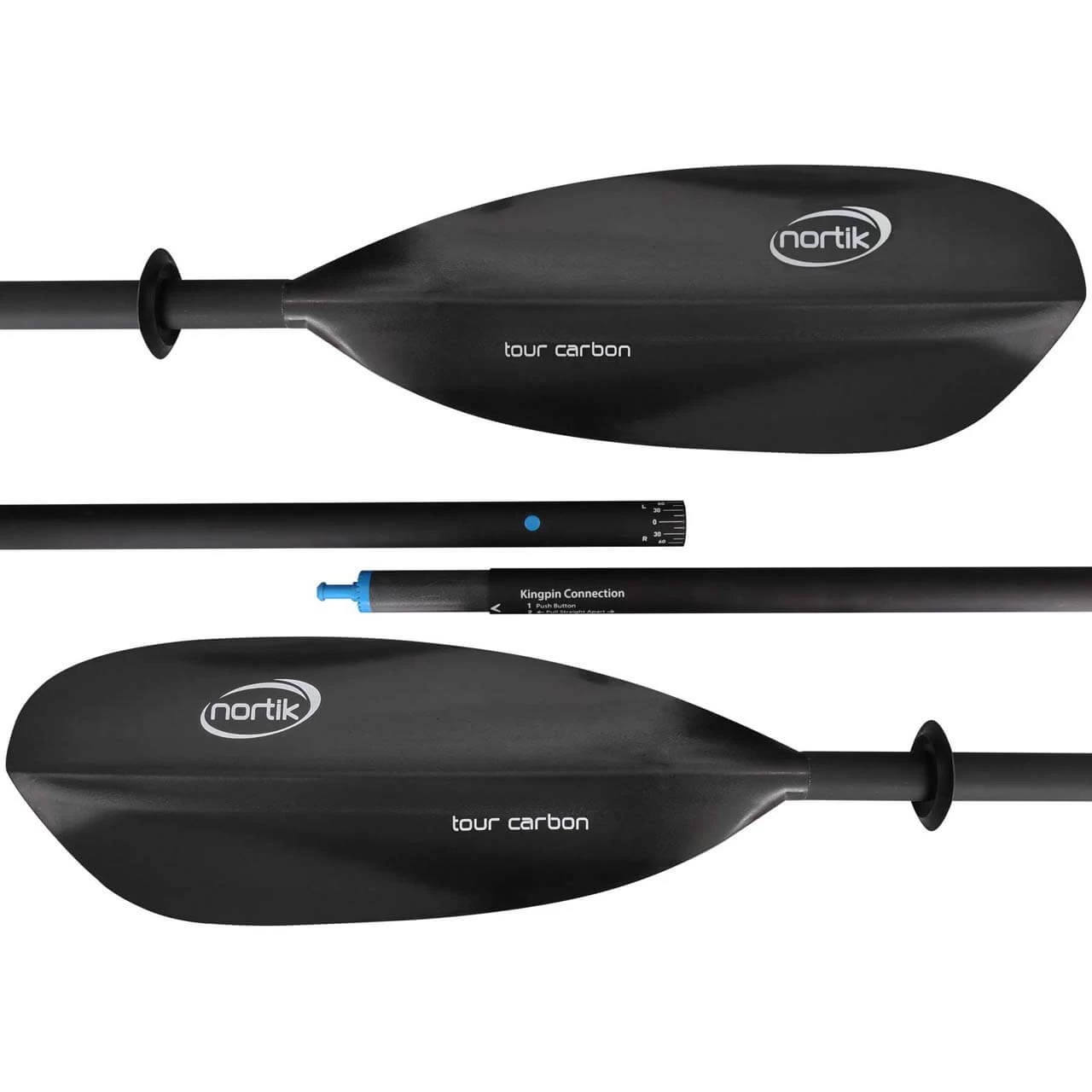 Das NORTIK TOUR CARBON PADDEL ist ein vierteiliges Tourenpaddel mit Carbonschaft und Blättern aus carbonverstärktem Nylon. Dieser Materialmix sorgt für ein ausgezeichnetes Verhältnis von Performance, Gewicht und Preis. Das Carbon Kajakpaddel ist mit der Kingpin-Teilung ausgestattet, die eine frei wählbare Verschränkung in 15-Grad-Schritten zulässt. Der Schaft ist ovalisiert und liegt auch bei langen Ausfahrten sehr angenehm in der Hand. Die steifen Paddelblätter bieten eine optimale Kraftübertragung und erlauben ein ermüdungsarmes Paddeln. Bei Reisen nimmt das Paddel ein Minimum an Platz ein. Das 4-teilige Touringpaddel Nortik Tour Carbon ist ein kompakter Begleiter auf Schlauchboot- und Faltboottour.