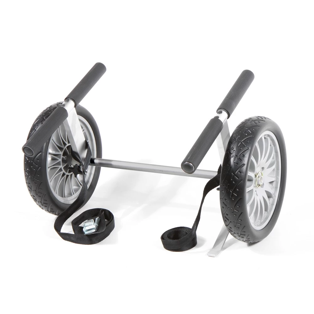 Crossover light: Die leichte Variante des bewährten Bootswagen Crossover. Sehr leichte, und trotzdem einigermaßen breite Räder reduzieren das Gewicht um ca. 300 Gramm gegenüber der Standard Variante. Die Räder sind geschäumt und somit unplattbar.