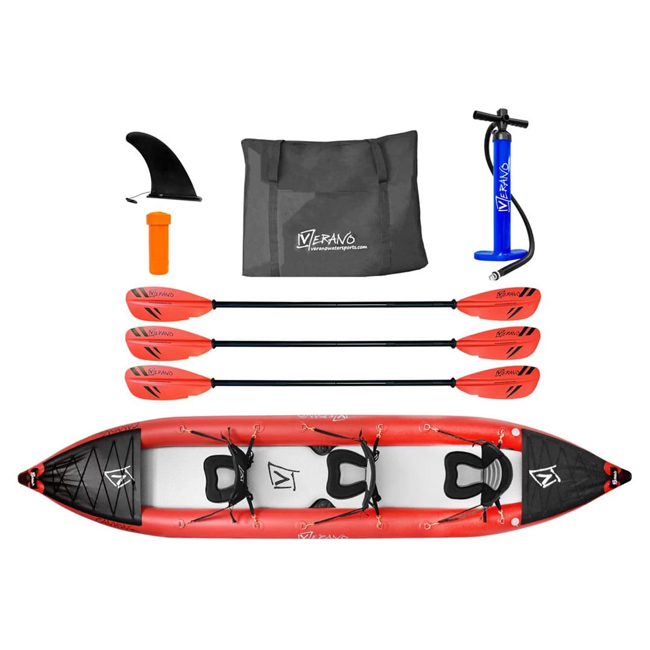 Das VERANO CANYON TRIO ist ein vielseitiges aufblasbares Paddelboot mit großzügigem Platzangebot für bis zu 3 Personen. Das 3-sitzige Freizeit-Kajak mit stabilem Drop-Stitch-Boden glänzt mit kleinem Packmaß und einfachem Aufbau. Das Canyon Trio ist zudem dank der seitlichen Luftschläuche sehr kippstabil. Durch die hochgezogenen Enden bleibt das Canyon Trio trotz seiner Länge noch leicht lenkbar. Mit dem stabilen Drop-Stitch-Flachboden eignet sich das Verano-Freizeitboot für Seen, Flüsse (mit leichtem Wildwasser) und das Meer. Je nach Anzahl der Sitze kann das Canyon Trio ohne Einschränkung alleine, zu zweit oder mit 3 Personen gepaddelt werden.